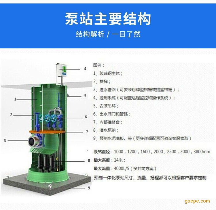 设备配置:3000mm*6500mm玻璃钢筒体(含压花铝板井盖、GPR安全格栅、304不锈钢操作平台、通风 管、爬梯、人孔及筒体底部自动清淤系统)。潜污泵,提篮格栅、管道系统、阀门系统、智能控制.
